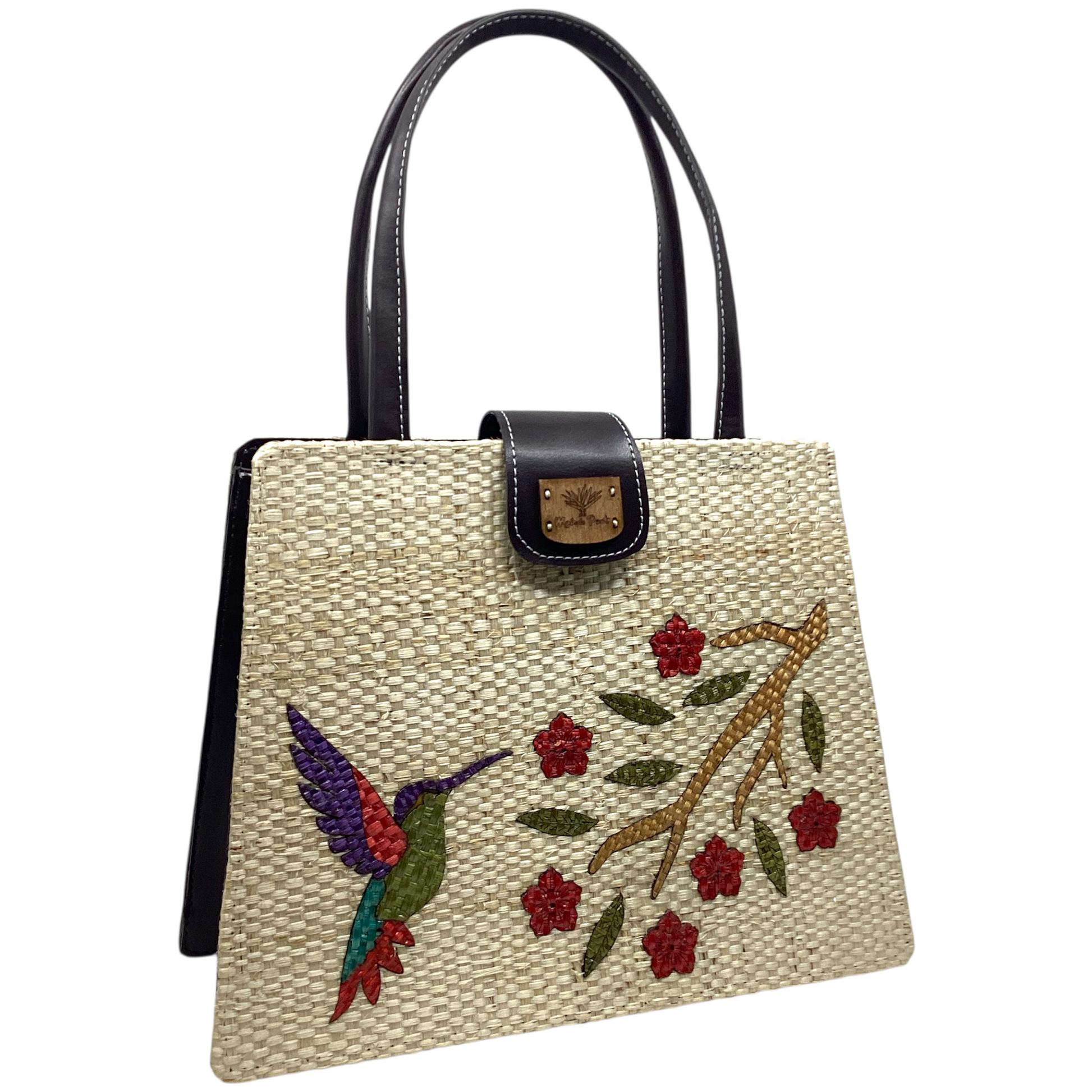 Este bolso es una verdadera obra de arte hecha a mano con fibra 100% natural de henequén, tejida en telar de cintura maya. Su diseño clásico incluye una aplicación de colibri que le da un toque distintivo y elegante.